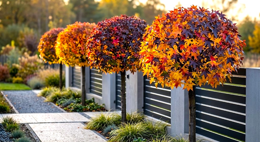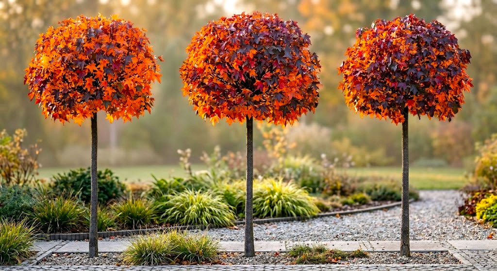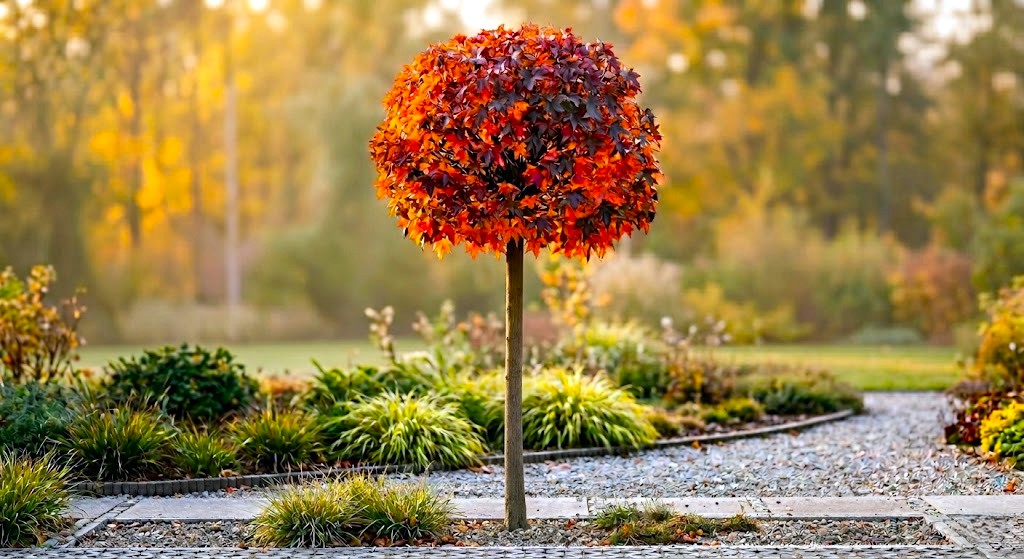 Ambrowiec Gumball szczepiony na pniu rośnie bardzo wolno, tworząc niezwykle zwartą, idealnie kulistą koronę, która z czasem pięknie się zagęszcza bez żadnej ingerencji sekatora. Liście są średniej wielkości, o lśniącej, skórzastej blaszce, która w pełnym słońcu nabiera najgłębszych, jesiennych odcieni. Pod gęstą kopułą liści kryje się ciekawa struktura pędów, które z wiekiem pokrywają się charakterystycznymi, korkowymi naroślami, stanowiącymi unikalną ozdobę drzewa w stanie bezlistnym. Korona osadzona na wysokim pniu jest idealna do tworzenia eleganckich szpalerów, nasadzeń wzdłuż ścieżek oraz jako luksusowy akcent w dużych donicach tarasowych.