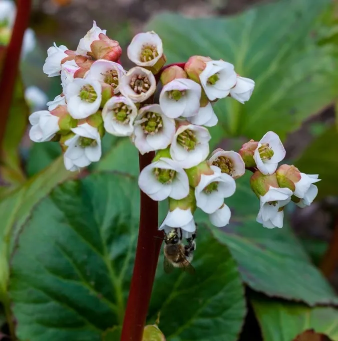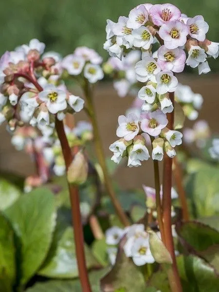 Bergenia sercolistna 'Jelle' to efektowna, zimozielona bylina o dużych, błyszczących liściach, które jesienią przebarwiają się na bordowo. Tworzy zwarte kępy i wyróżnia się biało różowymi kwiatami.