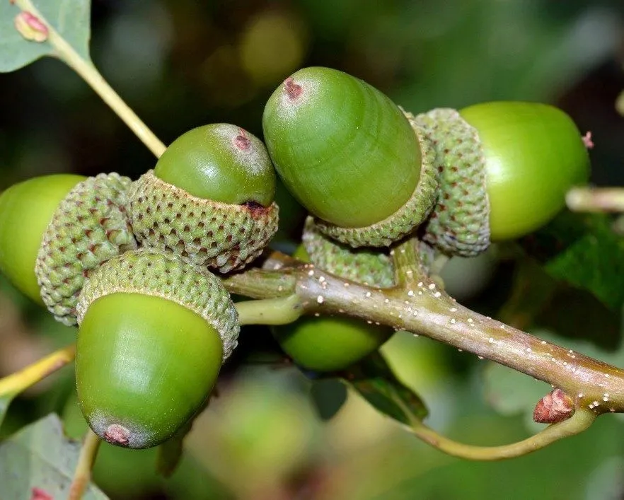Owoce: Żołędzie dojrzewają na krótkich szypułkach, stanowiąc pokarm dla dzikich zwierząt.