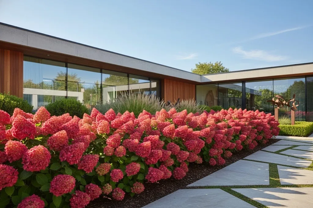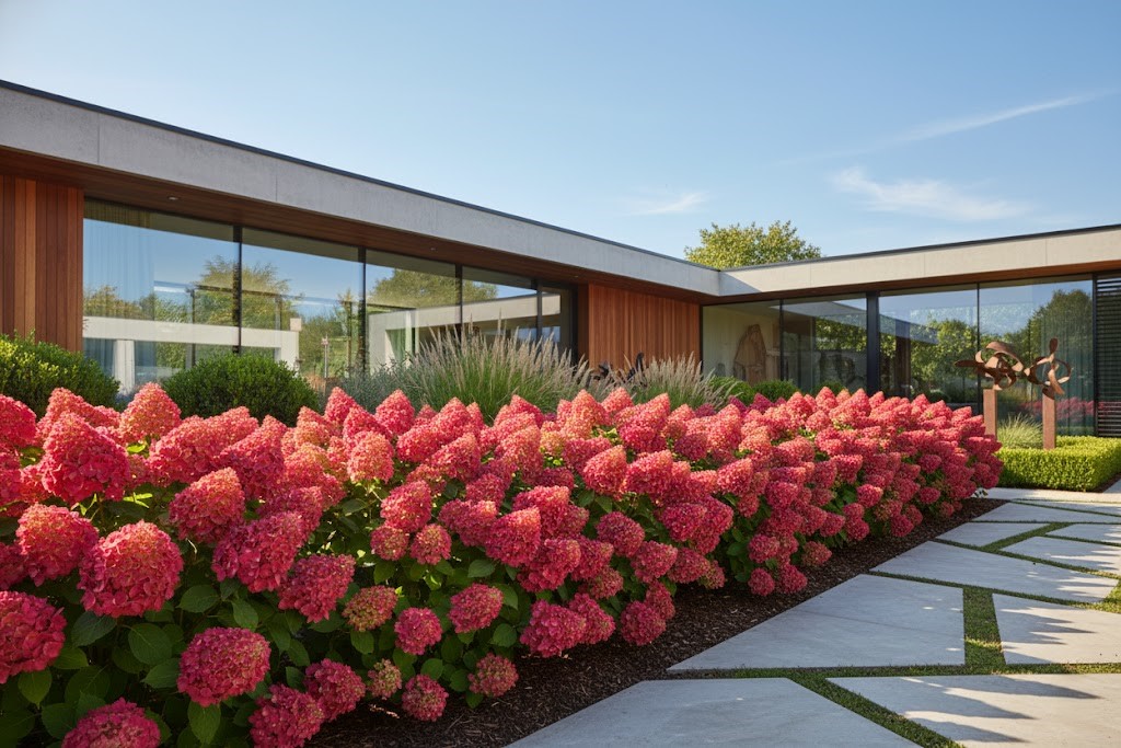 Hortensja bukietowa 'Bonfire' to krzew o zwartym, gęstym pokroju i wyjątkowo sztywnych pędach, osiągający około 1,2 do 1,5 metra wysokości. Jej kwiatostany są prawdziwym rarytasem – bardzo duże, stożkowate wiechy o gęstym upakowaniu kwiatów płonnych. Roślina ta charakteryzuje się niesamowitą zmiennością: początkowo limonkowe i białe, szybko zmieniają barwę na intensywny, ciemny róż i głęboką czerwień. Pełnię nasycenia osiąga późnym latem i jesienią, stanowiąc bezdyskusyjnie najbardziej dominujący punkt kolorystyczny w całym ogrodzie.