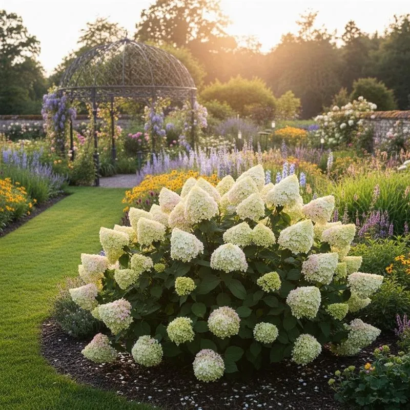 Hortensja bukietowa 'Diamantino' to krzew, który charakteryzuje się harmonijnym wzrostem, osiągając zazwyczaj od 1,2 do 1,5 metra wysokości. Jego kwiatostany są prawdziwym rarytasem – bardzo duże, niezwykle gęste, stożkowate wiechy o długości do 20-30 cm. Roślina ta, znana ze swojej nieskazitelnej barwy, początkowo kwitnie na seledynowo, by szybko przejść w krystaliczną biel, a pod koniec lata nabrać subtelnych, różowych rumieńców. Pełnię kwitnienia osiąga od czerwca aż do września, stanowiąc jasny, dominujący akcent kolorystyczny w ogrodzie.