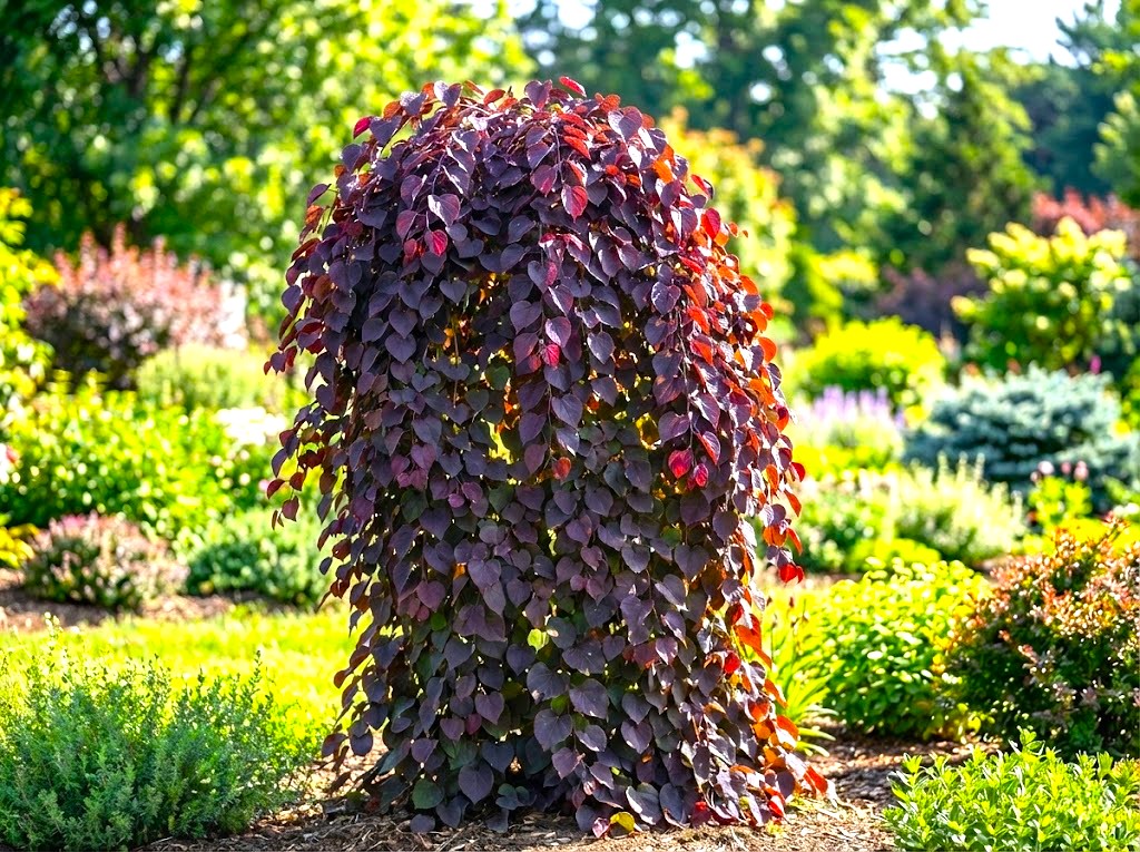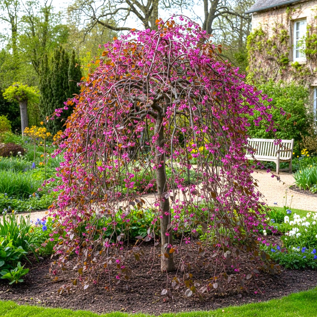 Pierwszych, bajecznych kwiatów wyrastających prosto z pędów możesz spodziewać się bardzo szybko, często już w 1-2 roku po posadzeniu dzięki zastosowaniu techniki szczepienia. Drzewo kwitnie regularnie i niezwykle obficie, tworząc na zwisających gałęziach girlandy różowych kwiatostanów. Ze względu na swój unikatowy, płaczący pokrój, każda kropla deszczu na rubinowych liściach potęguje wrażenie żywego klejnotu w ogrodzie. Jest to odmiana, która z każdym rokiem zachwyca coraz dłuższą kaskadą barwnych liści, stanowiąc najzdrowszą dla oka, barwną dekorację prosto z Twojej posesji.