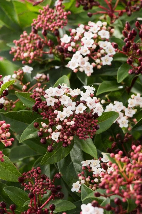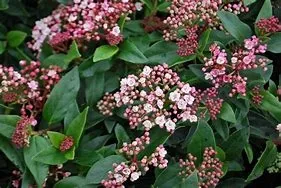 Kalina wawrzynowata 'Lisa Rose' (Viburnum tinus) to zimozielony krzew o gęstej, zwartych pokroju, który wyróżnia się pięknymi kwiatami oraz dekoracyjnymi, ciemnozielonymi liśćmi. Idealna do ogrodów przydomowych, na żywopłoty czy jako soliter.