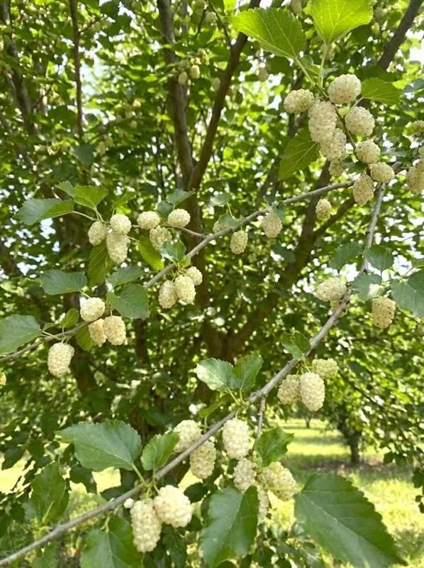 Morwa Biała to drzewo o szybkim wzroście, które tworzy gęstą, kulistą i bardzo dekoracyjną koronę. Owoce są niezwykle atrakcyjne – osiągają około 2-3 cm długości, są miękkie, soczyste i charakteryzują się bardzo słodkim, mdławym posmakiem bez wyczuwalnej kwasowości. Choć ich nazwa sugeruje kolor biały, mogą przybierać barwy od kremowej po lekko żółtawą. Są skarbnicą witamin i minerałów, idealnie nadając się do bezpośredniego spożycia prosto z drzewa oraz na lecznicze nalewki i susze. Dojrzałość zbiorczą osiągają sukcesywnie od końca czerwca do sierpnia.
