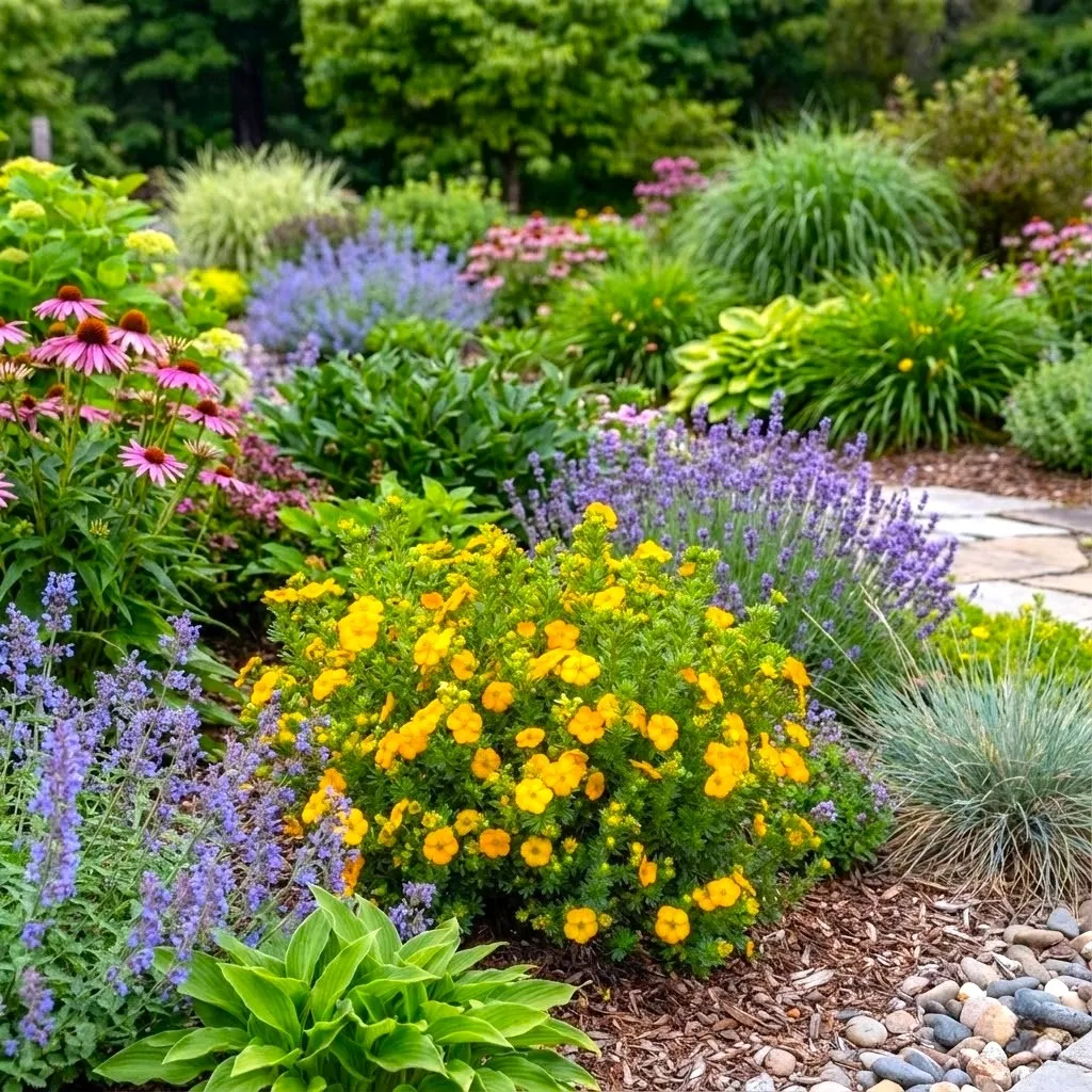 Pierwszych, słonecznych kwiatów możesz spodziewać się już w pierwszym roku po posadzeniu. Pięciorniki te kwitną bardzo obficie i nieprzerwanie, obsypując pędy setkami jaskrawych kwiatostanów przez cały sezon. Aby zachować ich zwarty pokrój i stymulować roślinę do jeszcze intensywniejszego zawiązywania pąków, warto wiosną delikatnie przyciąć krzew. Jest to doskonała odmiana ozdobna, która przy odpowiednich warunkach na stanowisku słonecznym zachowuje swój wyjątkowy, nasycony kolor i świeżość od wczesnego lata aż do późnej jesieni.
