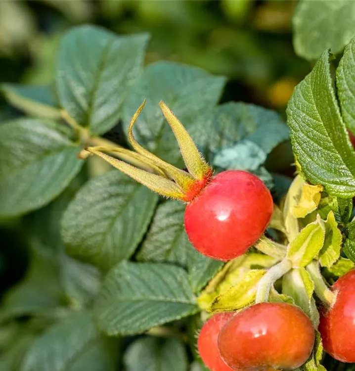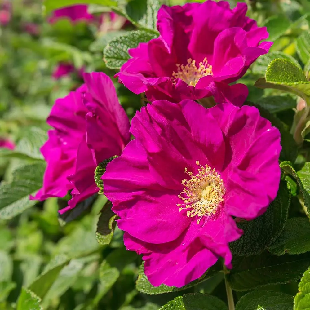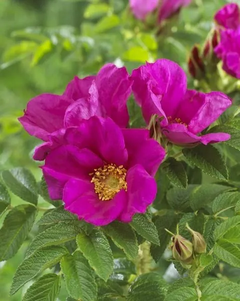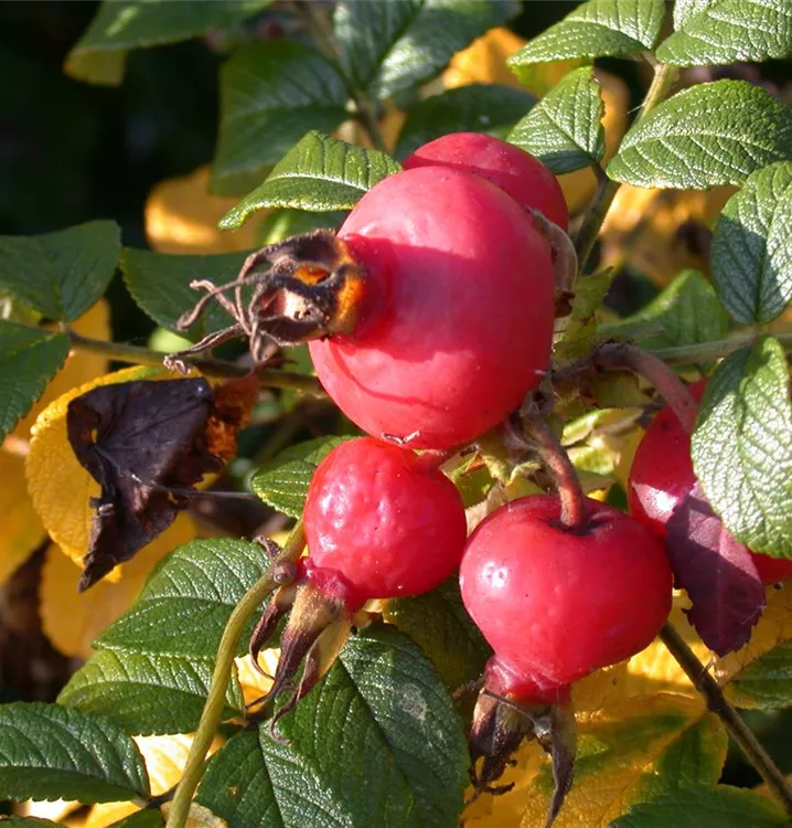 Właściwości: Róża pomarszczona jest miododajna, jej owoce mają właściwości wzmacniające odporność, a jej gęsty pokrój sprawia, że doskonale nadaje się na naturalne żywopłoty i zabezpieczenie skarp.