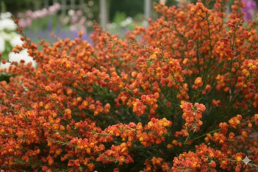 Żarnowiec Lena rośnie umiarkowanie silnie, tworząc gęsty, miotlasty pokrój o wzniesionych, zielonych pędach, które z czasem pięknie się zagęszczają. Kwiaty są średniej wielkości, o lśniących, czerwono-pomarańczowych płatkach zewnętrznych, które skrywają złocistożółte wnętrze. Pod delikatną strukturą motylkowych kwiatów kryją się drobne, zielone listki, które stanowią tło dla intensywnych barw. Kwiaty są idealne do tworzenia barwnych kompozycji na skarpach, skalniakach oraz jako element naturalistycznych rabat. Pełnię swojego kwitnienia osiągają zazwyczaj w maju i czerwcu.