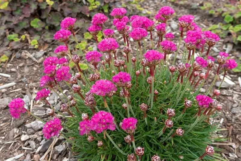 Roślina kwitnie obficie od maja do lipca, wytwarzając różowoczerwone, kuliste kwiaty na cienkich, sztywnych łodygach. Po przekwitnięciu można przycinać kwiatostany, co stymuluje roślinę do powtórnego kwitnienia pod koniec lata.