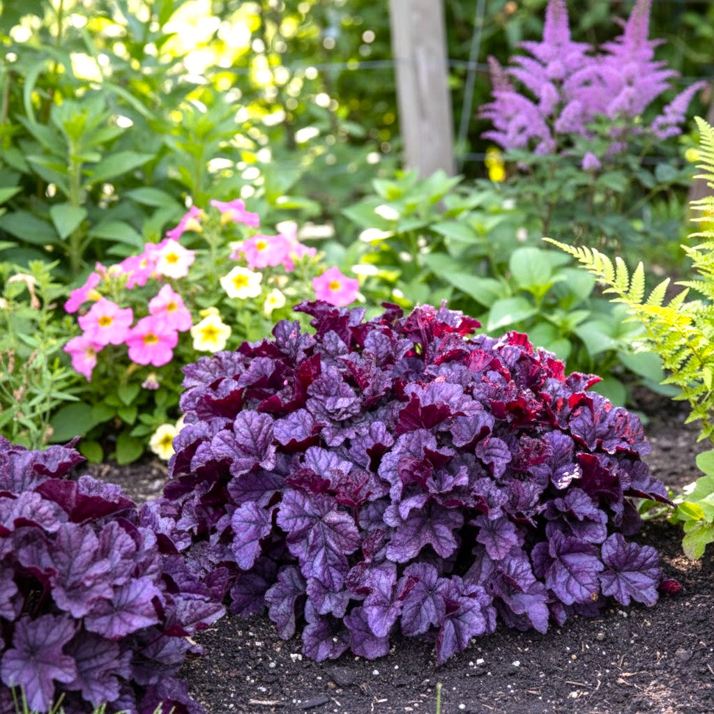 Żurawka Wild Berry rośnie umiarkowanie silnie, tworząc niezwykle kształtną, gęstą kępę, która z czasem pięknie się zagęszcza. Liście są średniej wielkości, o lśniącej, niemal lustrzanej powierzchni, która w pełnym słońcu nabiera wyjątkowo nasyconego, ciemnofioletowego odcienia z wyraźnym, czarnym unerwieniem. Pod grubą, pofalowaną skórką kryje się soczysty, purpurowy spód, co daje efekt niesamowitej głębi. Są one idealne do tworzenia barwnych obwódek, kompozycji w donicach oraz jako kontrastowy akcent na rabatach. Pełnię swojego jagodowego blasku zachowują przez cały rok, zdobiąc ogród również zimą.